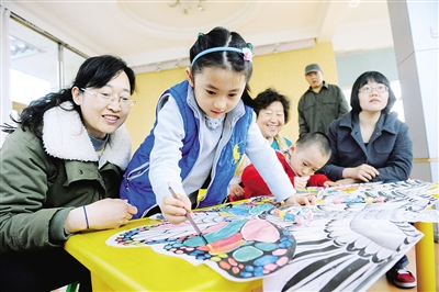 清明假期,北京陶然亭公园举办风筝扎制表演、风筝绘画比赛等活动。图为小朋友和家长在老师指导下一起为风筝绘画上色。