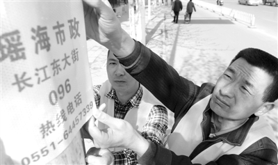 4月8日,合肥市瑶海区的市政工作人员在长江东大街上为路灯统一安装“身份证”。