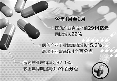 另据国家发展改革委近期公布的数据显示,今年1月至2月,医药产业完成产值2914亿元,同比增长22%,继续保持平稳增长态势。医药产业工业增加值增长15.3%,高出工业增速5.4个百分点;医药产业产销率为97.1%,较上年同期提高0.7个百分点。