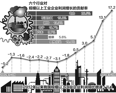 重工业成为拉动规模以上工业企业利润增长的主要动力。今年1至2月份,电力、石油加工、钢铁、电子、汽车等5个重工业行业对规模以上工业企业利润增长的贡献率近八成。