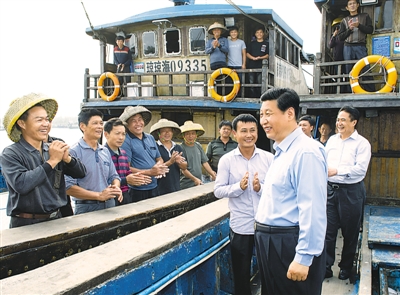 习近平亲切看望了由潭门渔民组成的海上民兵连,看连史展览,听事迹介绍,勉励他们努力学习现代装备知识,提高作业能力,在带领渔民耕海致富的同时,积极做好收集远洋信息、支援岛礁建设等工作。