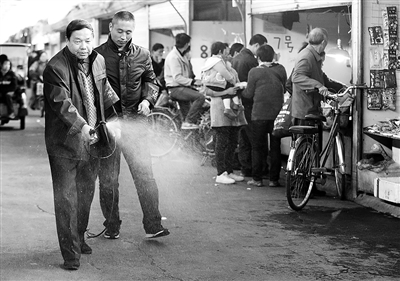 4月14日,北京高庙农贸市场工作人员正在消毒。北京日前确认发现首例H7N9禽流感病例后,已全面加强防控。
