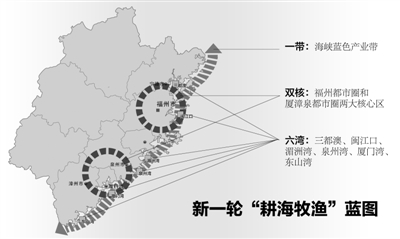 未来,福建将着手描绘新一轮“耕海牧渔”蓝图,优化海洋经济布局,突出海峡、海湾、海岛优势,逐步推进海岸、海岛、近海、远海开发,开创出“一带(海峡蓝色产业带)、双核(福州都市圈和厦漳泉都市圈两大核心区)、六湾(三都澳、闽江口、湄洲湾、泉州湾、厦门湾、东山湾)、十岛(平潭、东山、湄洲、琅岐等10个海岛)”的海洋经济开发新格局。