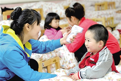 4月15日,北京市丰台区第一幼儿园的老师在为小朋友测量体温。针对当前禽流感疫情,北京市教育部门要求加强疫病防控。