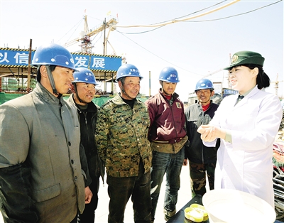 4月19日,辽宁省营口市边防支队医生李璐皓(右一)向辖区建筑工地的外来务工人员演示洗手方法,详细介绍H7N9禽流感防范常识。近日,辽宁省营口市边防支队组织官兵深入辖区建筑工地开展关爱外来务工人员、预防H7N9禽流感活动。 王朝辉摄(新华社发)