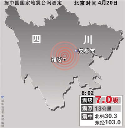 综合本报及新华社消息 北京时间4月20日8时2分,在四川省雅安市芦山县境内(北纬30.3度,东经103.0度)发生7.0级地震,震中距芦山县城19公里,震源深度约13公里。