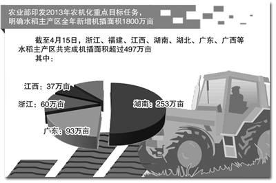 本报讯 记者张雪报道:20日“谷雨”前后,南方各省水稻机械插秧进入高潮。截至4月15日,浙江、福建、江西、湖南、湖北、广东、广西等水稻主产区共完成机插面积超过497万亩,其中湖南253万亩,广东93万亩,浙江60万亩,江西37万亩。