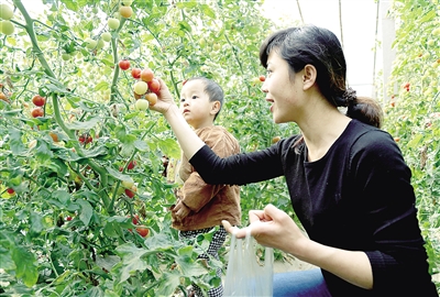 市民在山东省聊城市莘县的鲁西现代农业示范园里体验采摘活动。莘县是我国重要的蔬菜生产基地,是国家级出口食品农产品质量安全示范区,蔬菜总产达380万吨。目前,该县建有标准化种植基地27处。