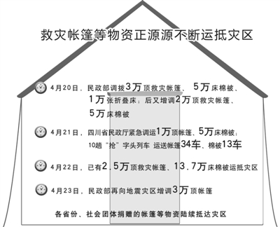 连日奔走灾区,记者对受灾群众面对灾难时的坚强深感敬佩。“烟尘消失和送走伤员后,大家都在乡村干部的组织下开展自救。”龙门乡乡长陈刚则告诉记者,由于各种原因,目前抵达芦山的帐篷仍难以满足需求,“我们会首先把它们送到最需要的村民手中,随着救灾物资源源不断运来,相信帐篷短缺的状况会迅速改观。”