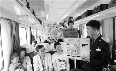 4月23日,在兰州开往上海的T118次列车上,列车员将旅客乘车安全重点注意事项制作成卡通漫画安全宣传板,向旅客解说。面对即将到来的“五一”黄金周客流高峰,兰州铁路局兰州客运段通过这种通俗易懂的宣传形式,提高旅客乘车安全意识。