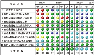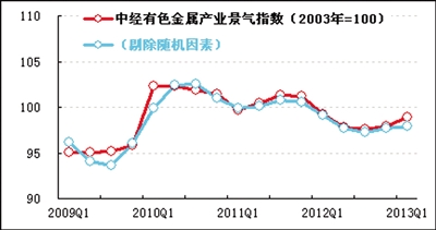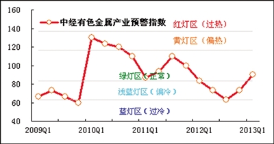 2013年一季度,中经有色金属产业景气指数为98.9,较去年四季度回升1.0点;中经有色金属产业预警指数为90.0,较去年四季度上升16.7点,已由“浅蓝灯区”中线区域上行至“绿灯区”下线区域。