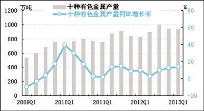 经初步季节调整,一季度,我国十种有色金属产量为933.8万吨,同比增长13.5%,增速较去年四季度加快1.2个百分点。