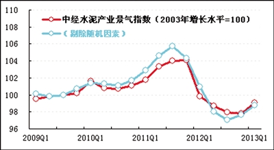 2013年一季度,中经水泥产业①景气指数为99.0(2003年增长水平=100),较去年四季度上升1.2点,结束了自2012年一季度以来的持续下滑态势,呈现企稳回升态势。进一步剔除随机因素,中经水泥产业景气指数为98.8(见中经水泥产业景气指数走势图中的蓝色曲线),比未剔除随机因素的水泥产业景气指数(见红色曲线)低0.2点,表明我国稳增长政策对于水泥产业景气度具有一定提振作用。