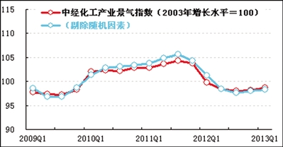 进一步剔除随机因素后,中经化工产业景气指数为98.3(见景气走势图中的蓝色曲线),较上季度上升0.3点,呈现企稳态势,但低于未剔除随机因素的景气指数0.3点。从两条景气指数曲线回升的幅度来看,包含随机因素的景气指数回升幅度比剔除随机因素的景气指数大0.2点,表明经济企稳回升受外部环境及其他因素影响,自身的增长动力略显偏弱。