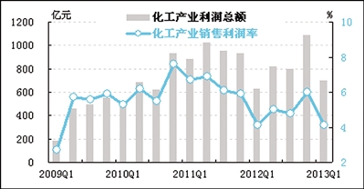 经测算,一季度化工产业销售利润率为4.1%,与去年同期持平,与上季度相比下降1.9点,比全部工业销售利润率低1.1个百分点。