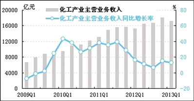 经初步季节调整,一季度我国化工产业主营业务收入为17222.2亿元,同比增长12.9%,增速较上季度回落2.2个百分点;环比下降5%。