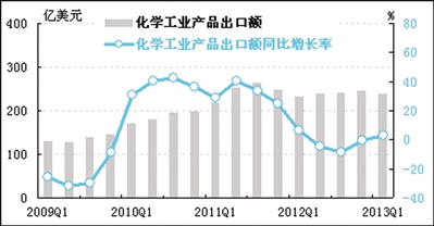 经初步季节调整,一季度化工产业出口额为239.6亿美元,同比增长3%,增速由同比下降转为同比增长;环比下降2.8%。