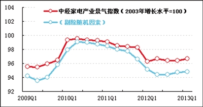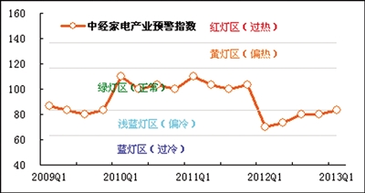 2013年一季度,中经家电产业景气指数为96.7,较上季度上升0.3点;中经家电产业预警指数为83.3,较上季度上升3.3点,一年后重新返回“绿灯区”内运行。