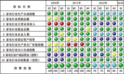 一季度,中经家电产业预警指数为83.3,较上季度上升3.3点,一年后重新回归代表行业运行正常的“绿灯区”内运行。在构成中经家电产业预警指数的10个指标(仅剔除季节因素,保留随机因素)中,位于“绿灯区”的有6个指标,位于“浅蓝灯区”的有3个指标,位于“蓝灯区”的有1个指标。