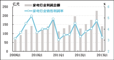 经初步季节调整,一季度家电行业利润总额为141.0亿元,同比增长10.6%,增速较上季度放缓4.9个百分点。一季度家电行业销售利润率为3.2%,较去年同期水平略有下降。