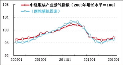 在进一步剔除随机因素后,一季度中经服装产业景气指数为97.1(见中经服装产业景气指数走势图中蓝色曲线),较上季度上升0.3点,比未剔除随机因素的景气指数值低0.4点,表明服装行业内生增长动力有所增强,政策因素对提升服装行业景气度的作用加大。
