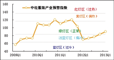 一季度,中经服装产业景气指数为97.5,较上季度上升0.5点,连续2个季度保持上行;中经服装产业预警指数为90.0,较上季度上升6.7点,连续4个季度保持上行。
