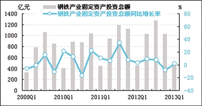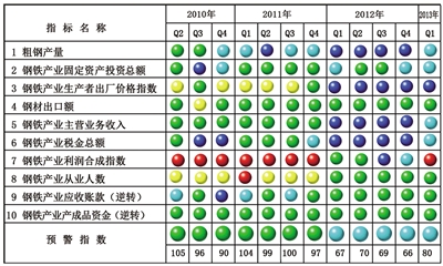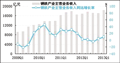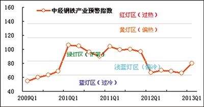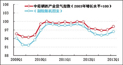 2013年一季度,中经钢铁产业景气指数为98.2,较上季度上升1.2点;中经钢铁产业预警指数为79.7,较上季度回升13.7点。钢铁业暂时延续了去年四季度的企稳态势。