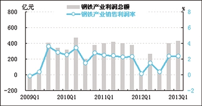 一季度,经初步季节调整,在钢材价格跌势趋缓的拉动作用下,钢铁行业利润总额为431.0亿元,较上季度增加31.8亿元,环比增长8.0%。一季度,钢铁行业销售利润率为2.3%,与上季度持平。