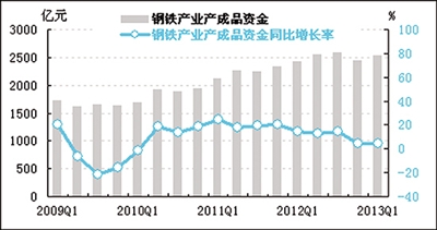截至一季度末,钢铁行业产成品资金为2534.8亿元,较2012年四季度末增加85.4亿元,而2012年四季度末较三季度末减少了136.6亿元;产成品资金同比增长4.4%,增速与上季度基本持平。