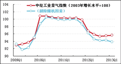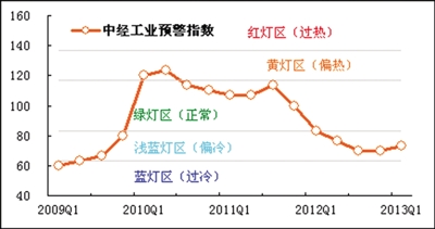 2013年一季度,中经工业景气指数为95.6,与上季度基本持平,延续温和回升的态势;中经工业预警指数为73.3,比上季度上升3.3点,在浅蓝灯区呈回升态势。