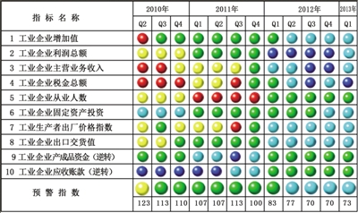 一季度,中经工业预警指数为73.3,比上季度上升3.3点,虽处浅蓝灯区,但呈回升态势,表明工业经济略有回暖。