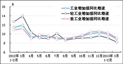 一季度,工业增加值同比增速为9.5%,比去年全年增速回落0.5个百分点。其中,轻、重工业增速分别为8.7%和9.8%,分别比去年全年回落1.4和0.1个百分点。工业生产增速回落与春节假期有关,其中,轻工业增速的回落与消费增速放缓有关。总体来看,由于国内外需求逐步回升,工业生产回升基础并未改变,不过,工业生产增速的回落也表明生产持续加速的艰难性。