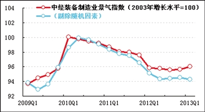 2013年一季度,中经装备制造业①景气指数为96.0(2003年增长水平=100),比去年四季度上升0.4点,在连续4个季度的低位运行之后出现温和回升,表明装备制造业景气度有所改善。