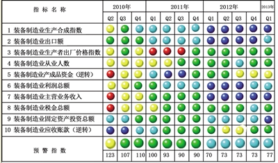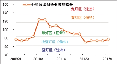 2013年一季度中经装备制造业景气指数为96.0,比去年四季度回升0.4点,在连续四个季度的低位运行后出现温和回升。中经装备制造业预警指数为76.7,比去年四季度提高3.3点,继续在偏冷的“浅蓝灯区”上部呈逐步回升态势。