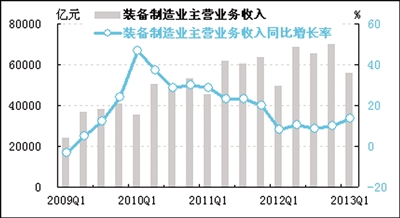 经初步季节调整,一季度装备制造业主营业务收入为56042.3亿元,同比增长13.6%,增速继去年四季度环比回升1.4个百分点后,一季度又比去年四季度提高3.7个百分点,进一步强化了回升的势头。