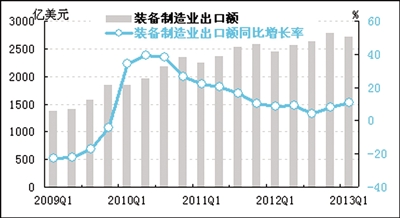 经初步季节调整,一季度我国装备制造业海关出口额为2710.8亿美元,同比增长10.9%,增速比去年四季度提升3.0个百分点,连续两个季度保持上升态势。而装备制造业企业的出口交货值增速略低于去年四季度水平。