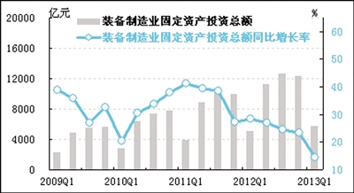 经初步季节调整,一季度装备制造业固定资产投资总额为5761.4亿元,同比增长14.5%,比去年四季度回落8.8个百分点。由于回落幅度相对较大,投资状况跌入了增长速度相对较慢的“蓝灯区”。据分析,装备制造业投资增速的回落与机械、汽车、仪器仪表制造业投资增速大幅回落密切相关。