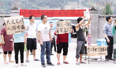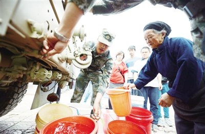 | 4月25日,在四川雅安地震灾区执行抗震救灾任务的成都军区铁拳师防化营官兵,为受灾群众安置点送水。 |