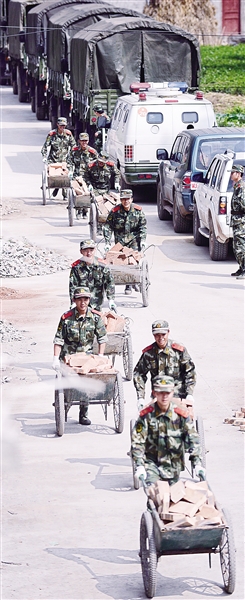 | 4月25日,武警四川总队一支队官兵下了卡车推小车,运砖铺“村路”。当晚,芦山县宝盛乡玉溪村1100多名村民将全部入住由武警四川总队一支队为他们支起的187顶帐篷。村头干活的魏大妈高兴地说:“这是我们的‘玉溪新村’!”刘海山摄(新华社发) |