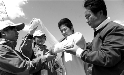 4月25日,北京海淀区东升镇,志愿者正在进行救护培训。当天,针对突发灾害的应急演练在此进行。经过培训的志愿者,向市民介绍应急救护知识。