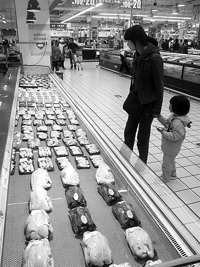 随后,记者来到北京市丰台区大成路物美超市,相比猪肉、牛羊肉柜台前人来人往,摆满乌鸡、柴鸡、鸡翅等家禽类食品的柜台前则“门庭冷落”。在现场,工作人员的吆喝声、醒目的降价牌并没有对消费者产生多少吸引力。工作人员小陈告诉记者,现在基本上所有家禽类食品都在降价,鲜三黄鸡的价格已经从每斤14.8元降到每斤10.8元,“超市所有家禽产品的货源品质都是有保障的,我们也会向顾客宣传一些禽流感知识,但这一段时间销售量还是很小。”