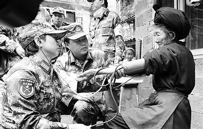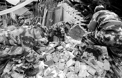 图①:空军部队在芦山县龙门乡古城村清理废墟。