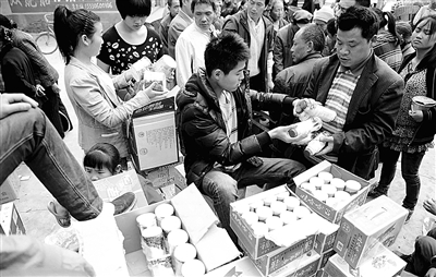 图③:26日,四川雅安芦山县地震灾区,受灾群众正领取救灾物品。 本报记者 李景录摄