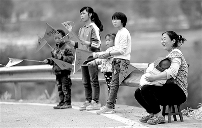 图⑤:四川芦山地震灾区,当地群众在路边打出自制标语,感谢救援人员。 本报记者 李景录摄