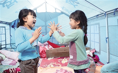 四川芦山县宝盛乡临时安置点帐篷内,两名儿童正在做游戏。目前,震区受灾群众的日常生活基本得到保障。