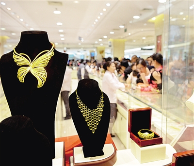 黄金价格的下跌刺激了国内消费者的购买欲望。5月2日,在菜百公司黄金饰品销售柜台购买黄金饰品的顾客络绎不绝。 新华社记者 李 鑫摄