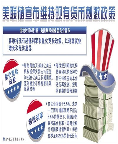 美国联邦储备委员会(美联储)5月1日宣布,为刺激就业增长和经济复苏,将继续维持现有超低利率和每月850亿美元的购债规模。同时明确指出,美国经济前景面临下行风险,并预测中期通胀水平将不超过其设定的2%的目标。美联储已做好准备根据就业和通胀的形势变化来增加或减少购债规模,以保持货币政策宽松适度。分析人士认为,由于美联储官员今年年初还在讨论淡出量化宽松的方案,如今同时列举出进退两种可能,显示美联储目前更加关注经济的下行风险,扩大量化宽松规模的可能性在增加。