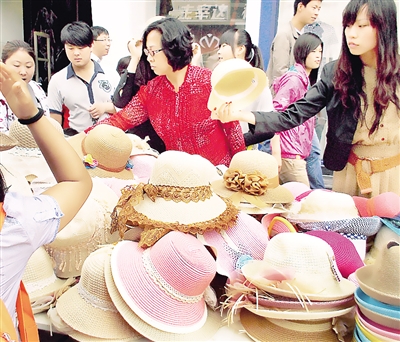 5月5日,在郑州市一条步行街上,市民们在挑选凉帽。随着立夏节气的到来,夏令时节的商品进入销售旺季。 新华社记者 王 颂摄