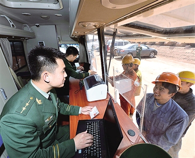 5月5日,岚山边防检查站的边检民警使用无线验放技术为港区职工办理涉外证件。该边检站自主研发边检移动执勤车,采用3G无线技术,在现场就能办理出入境、登轮证等边防检查手续,有效提高了办证效率。