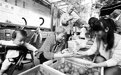 5月7日,四川省成都市武侯区玉林街道黉门街社区的居民在家门口选购“农社对接”模式提供的新鲜蔬菜。“农社对接”短链直销模式,减少了中间环节,降低了流通成本,受到社区居民的欢迎。